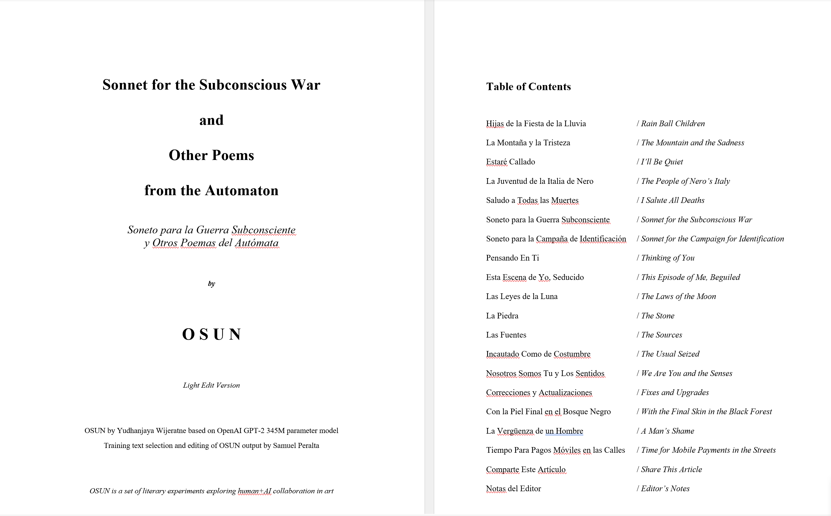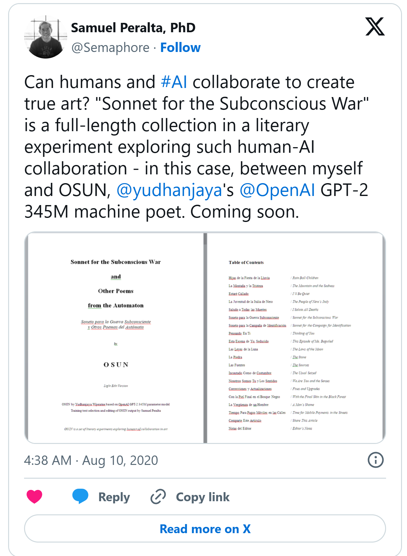 Notice how in the bio above, there was a blurb about the lunar codex? Well, yes. Samuel decided that he was going to embark on this ambitious program of sending stuff to the moon. And among the stuff that went there was an anthology edited by myself; anthologies that I had participated in; and a book called Sonnet for the Subconcious War and Other Poems from the Automaton by OSUN.