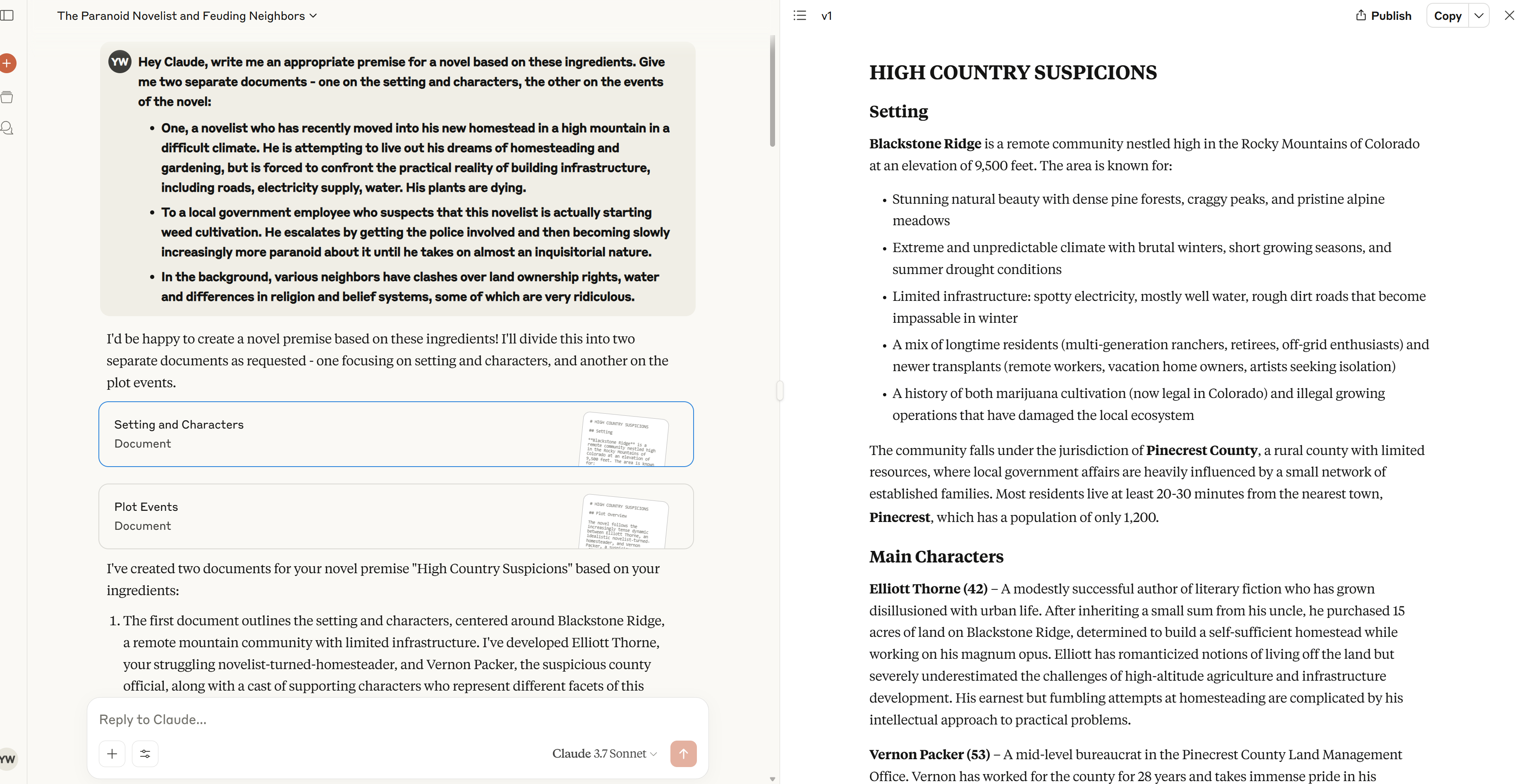 Hey Claude, write me an appropriate premise for a novel based on these ingredients. Give me two separate documents - one on the setting and characters, the other on the events of the novel:
